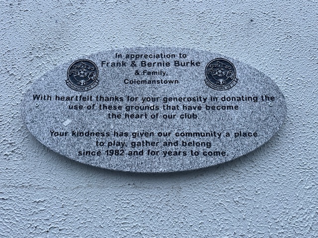 The piece of ground donated by Frank & Bernie Burke allowed Colemanstown United to put down roots. It enabled the club to apply for grant funding, to develop proper facilities & to grow the club into what we see today. What was once a simple piece of grazing land used as a playing pitch has now evolved into something far greater. It is now a place of sport & community & a facility for everyone to enjoy. That journey would not have been possible without the generosity of Frank & Bernie Burke & their family.